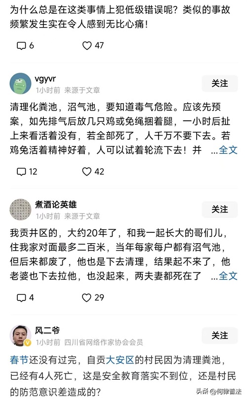 还有来自当地的网友留言:贡井区的,大约20年了,和我一起长大的哥们,住我家对面最多二百米,当年每家每户都有沼气池,但后来都废,他也是下去清理,结果起不来了,他老婆也下去拉他,也没起来,两夫妻都死在了废沼气池里。