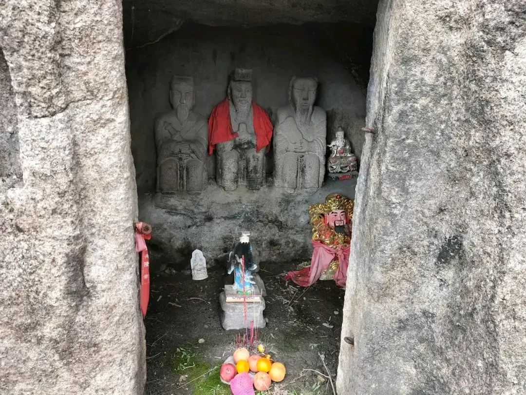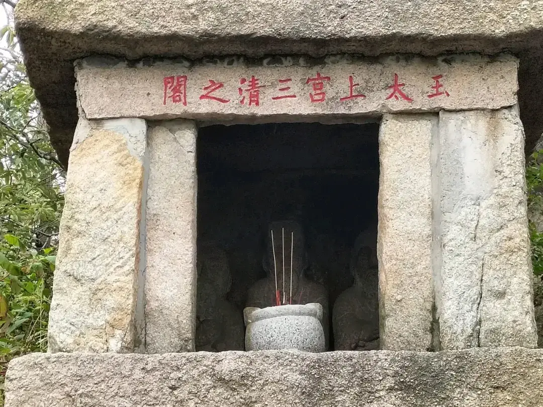 看到了简朴的三清、天地水三府之官殿,是石刻的,仍旧供有水果,和香火。看来经常有人前来朝拜。