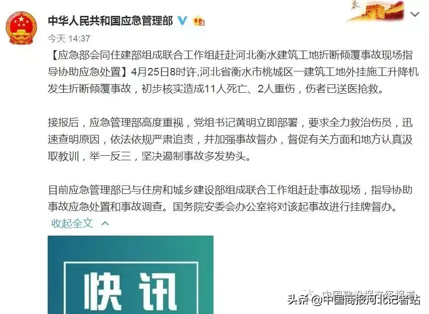 衡水工地事故致11死2重伤,应急管理部与住房和城乡建设部联合工作组已赶赴现场