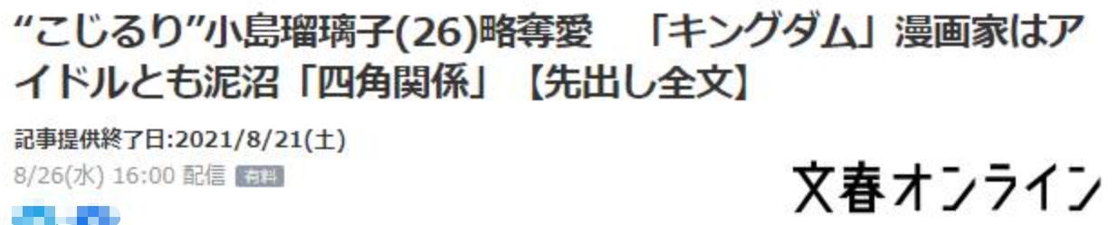 然而2020年7月,日媒拍到她和漫画《王者天下》的作者原泰久约会,并爆料是女方主动追求男方。这一新闻令她的形象翻车,毕竟所有人都知道原泰久已婚,有三个孩子。