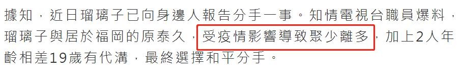 后来原泰久宣布了离婚消息,说自己在2020年3月已经和前妻分开,明确表示自己和瑠璃子在一起时是单身。但他短时间内和年轻女明星恋爱,无缝衔接的状态仍引来骂声。