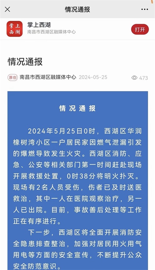大皖新闻记者注意到,25日晚间网上流传着一张南昌市西湖区融媒体中心发布的“情况通报”,通报中提到,5月25日0时,西湖区华润橡树湾小区一户居民家因燃气泄漏引发的爆燃导致发生火灾,西湖区消防、应急、公安等相关部门第一时间赶赴现场救援处置,0时38分将明火扑灭,现场有2名人员受伤,伤者已及时送医救治,其中一人在医院观察治疗,另一人已出院,目前,事故善后处理等工作正在有序进行。