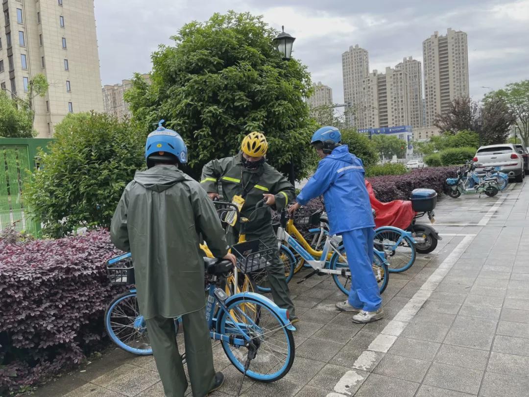 (图为外卖小哥整理共享单车。)
