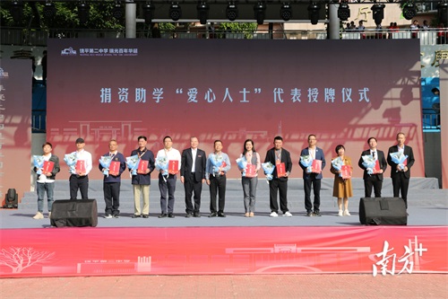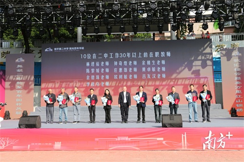 大会为任教30年以上的10位在职教师颁发荣誉证书,为14位爱心人士代表授牌并合影留念,现场尊师重教氛围浓厚。另外,现场组织了丰富多彩的文艺展演,二中学子们青春洋溢,以演唱、舞蹈、朗诵等形式展现校园生活的点滴以及对老师、学校的祝福和感恩。“很幸运能成为二中学子,我会继续努力,争取成为社会的栋梁之才。”在校学生吕旷怡说。