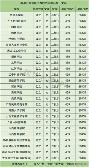 在山西省压二本线的公办学校名单文科一共有25所,包括中原工学院、齐齐哈尔医学院、湘南学院、河西学院以及湖南人文科技学院等,对于刚过二本线的文科生,可将这些学校作为备选学校,同时请务必选择服从专业调剂,这样被录取的概率会更大。