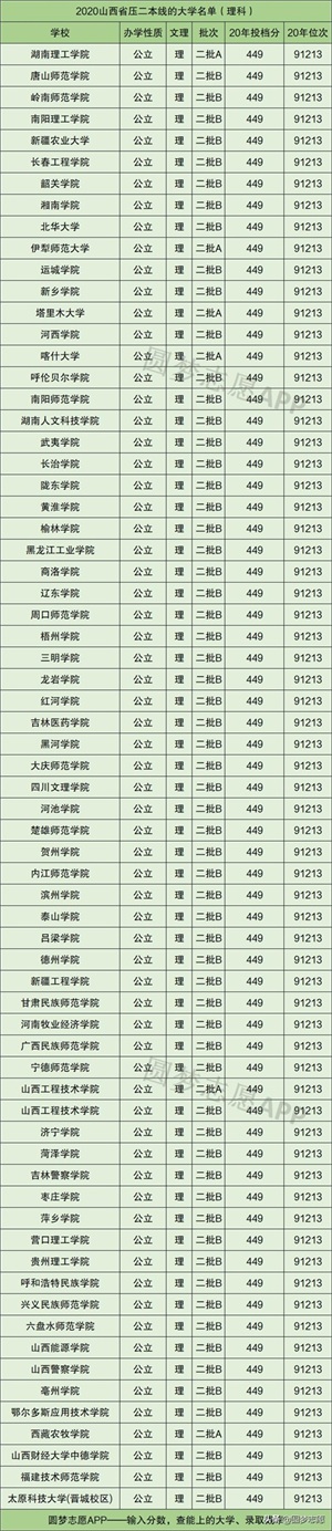 在山西省压二本线的公办学校名单理科一共有68所,包括湖南理工学院、唐山师范学院、岭南师范学院、南阳理工学院以及新疆农业大学等,对于刚过二本线的理科生,可将这些学校作为备选学校,同时请务必选择服从专业调剂,这样被录取的概率会更大。