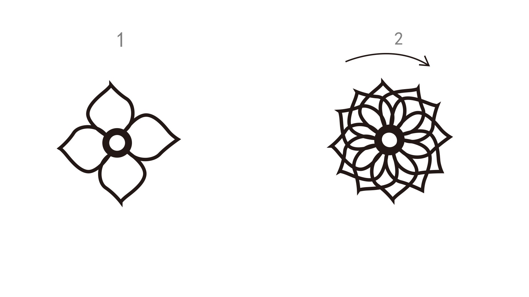 第二步:这个4片花瓣为延伸,再旋转重复画2个这个样的图形,这样不一样的图形就出来了!