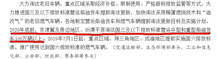《打赢蓝天保卫战三年行动计划》中指出,2020年底前,京津冀及周边地区、汾渭平原淘汰国三及以下排放标准营运中型和重型柴油货车100万辆以上。