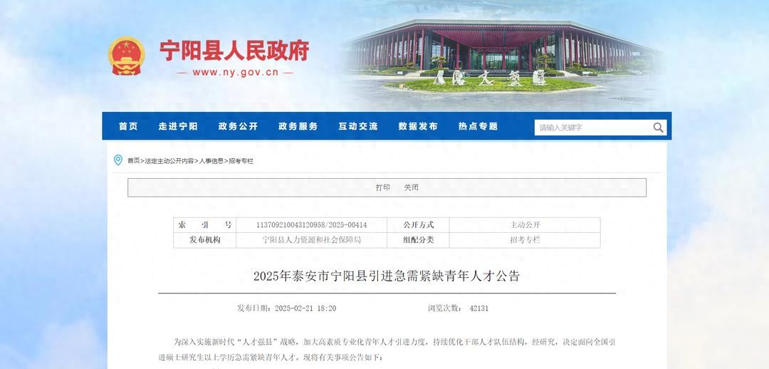 2月21日,宁阳县人民政府官网发布2025年泰安市宁阳县引进急需紧缺青年人才公告: