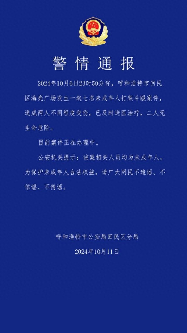 10月11日晚间,呼和浩特市公安局回民区分局发布警情通报:2024年10月6日23时50分许,呼和浩特市回民区海亮广场发生一起七名未成年人打架斗殴案件,造成两人不同程度受伤,已及时送医治疗,二人无生命危险。目前案件正在办理中。