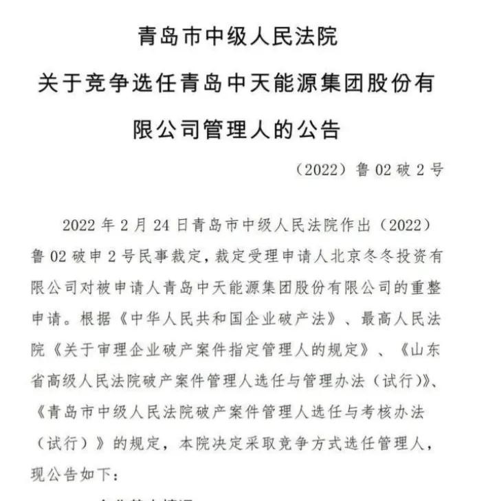 法院裁定受理北京冬冬对青岛中天的重整申请,并于2022年4月24日指定“北京浩天律师事务所”与“泰和泰(济南)律师事务所”为青岛中天管理人