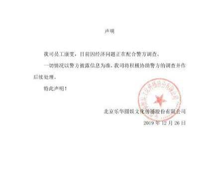 12月26日,王一博经纪公司乐华娱乐发布声明,承认王一博经纪人康雯被捕。声明中表示,康雯因经济问题正在配合警方调查,一切以警方披露信息为准,公司将积极协助警方的调查。据了解,近日有网友爆料称,乐华娱乐老板杜华举报王一博经纪人贪污,该经纪人已被警方带走。
