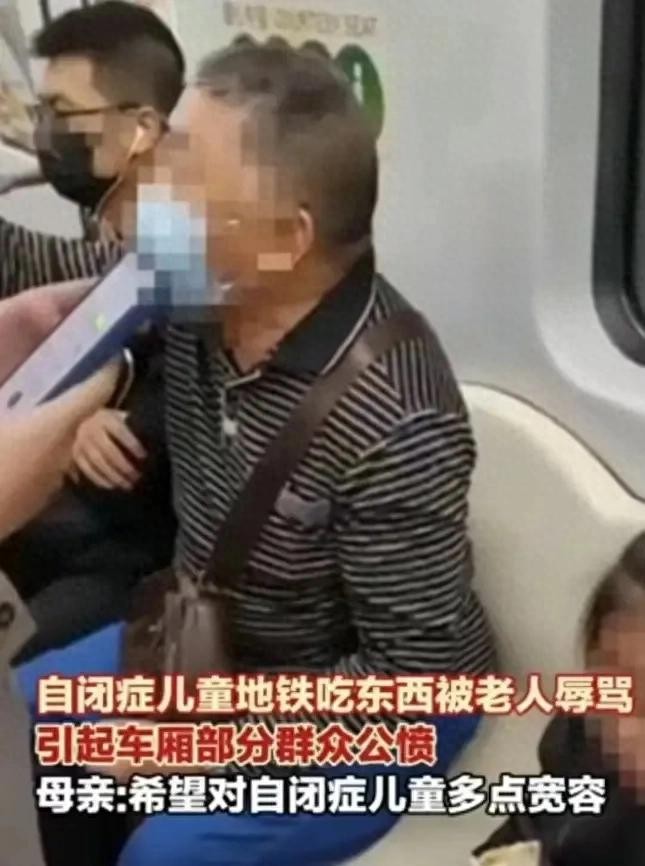 做妈妈的在地铁上喂小女孩吃东西,坐在旁边的老头不满,就开始说在地铁里不能吃东西。妈妈解释说,小女孩有自闭症,她从江苏送小朋友来上海上幼儿园,因为只有上海才有自闭症小孩子能上的幼儿园,路上时间要一个半小时,怕小孩子长时间坐地铁哭闹,才用零食安抚她。