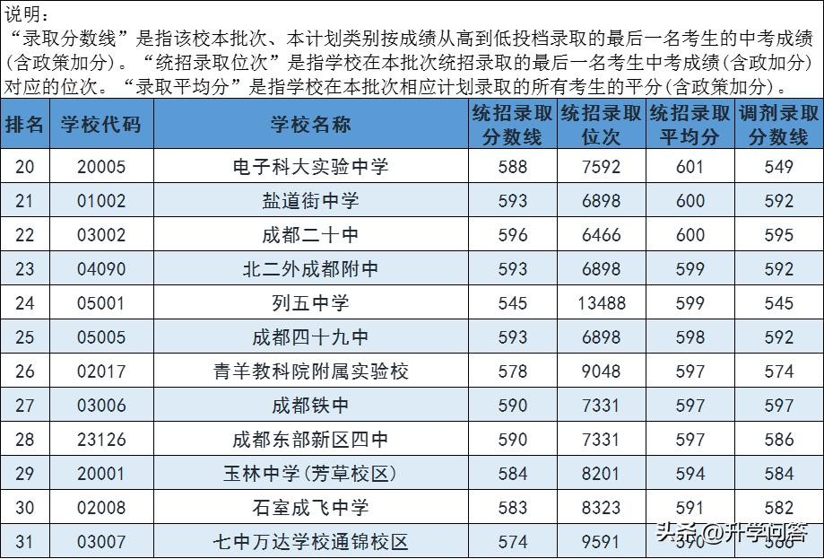 9月初的时候小编发过一篇“2024中考后成都高中大排名,排在前五十的有哪些?2025家长参考!”依据2024年的高中统招录取分数线,列出了成都市2024年统招分数线排名在前五十的学校,一共将其划分了五个梯队,没看过的朋友们可以点进去看看,一个学校到底好不好,光看统招分数线这一个数据是不准确的,还需要综合考虑学校近几年的录取平均分、录取位次、高考升学率等等。