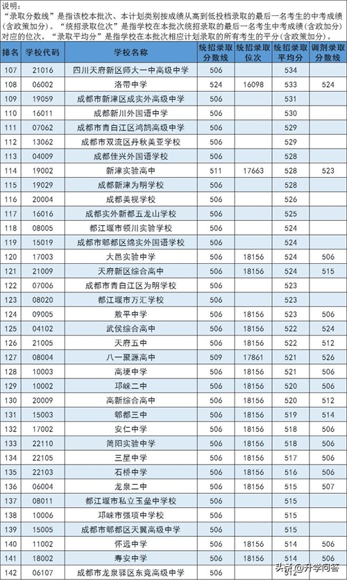 四川天府新区师大一中高级中学、洛带中学、成都市新津区成实外高级中学、成都新川外国语中学、新津实验高中、成都实外新都五龙山学校、大邑实验中学、都江堰市万汇学校、敖平中学、天府五中、八一聚源高中、高埂中学、邛崃二中、郫都三中、安仁中学、简阳实验中学、三星中学、龙泉二中等:这些学校的录取平均分排名虽然排在列表末尾,但并不代表着这些学校不好,相反,它们在各自的区域内都是优质的潜力学校,之所以录取分数偏低,那是因为受到了地理位置限制或资源条件的限制而相对较弱,但它们都在积极的为当地学生提供优质的教育教学服务,努力满足学生的多样化需求。