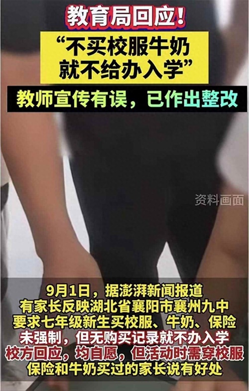 开学的第一件事,离不开报名入学。然而,湖北襄阳襄州九中的七年级新生入学,家长们却是满脸惊愕和为难,难在哪里?满心欢喜地送孩子去学校,迎接他们的却是一套交费套餐,套餐里有啥?620元的校服、280元的牛奶、140元的保险,加起来一共1040元!这套套餐金额可不是小数目,而且除了价高之外,还与入学捆绑在一起,家长反映,没有缴费记录的,就不得办理入学报名手续。