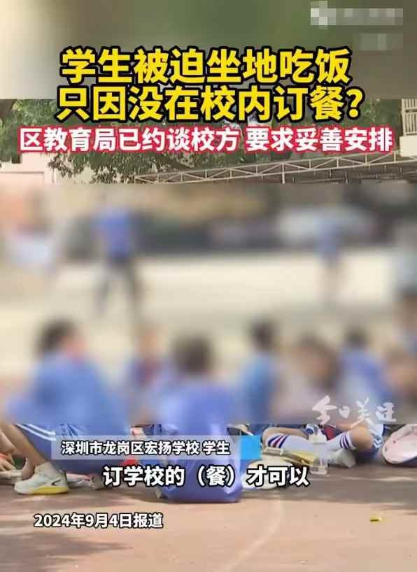 然而,深圳龙岗的宏扬学校这两天上了热搜,原因是大中午的,一大群学生却趴在操场上吃饭,这是为何?原来,这些学生没有在校内订餐,吃的是自家带来或者外面订的餐,学校就不让其进教室吃饭,而只能在操场吃。为什么学生不愿意在学校内订餐呢,不用说,学生和家长们的反映是质次价高,吃不饱吃不好,所以宁愿自己带饭或外卖。可就是因为这个原因,只能在露天操场吃饭,灰尘落叶飞虫等卫生情况不说,在南方近四十度高温下,吃个午饭不怕中暑吗?这怎么忍心啊。