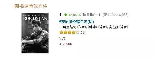 自10月13日19:00公布至10月13日24:00,获得2016年诺贝尔文学奖的鲍勃·迪伦所著回忆录《编年史》,在亚马逊的销量与前一天同时段相比增长超过了200 倍,图书总榜销售排名也从原先的4968名快速上升至11名,与其相关的关键词搜索比前一天也有了近100倍的增长。