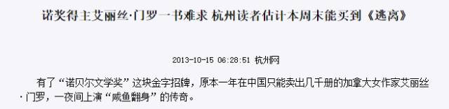 2013年诺贝尔文学奖得主艾丽丝·门罗的作品在获奖后一个月销量比获奖前一个月增长了近1500倍。