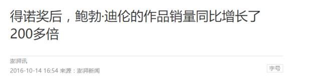 身为艺术家的鲍勃·迪伦获奖后,中国读者对他的关注度大增,根据亚马逊中国数据显示,与其相关的作品销量在奖项公布后一个月内增长高达61倍,「鲍勃·迪伦」关键词搜索量增长了30倍。