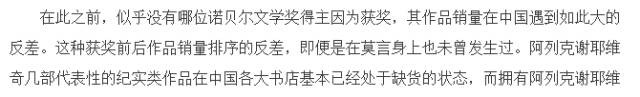 在最初公布获奖者的几天里,诺贝尔文学奖在国内再次实现出这令人咋舌的影响力。对比获奖前后一个月的作品销量,2015年得主斯维特兰娜·阿列克谢耶维奇获奖后其作品销量增长近74倍。