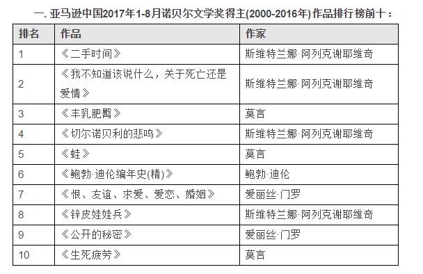 亚马逊中国回顾了2000-2016年诺贝尔文学奖得主作品的销售情况,榜单前十名均为2012年之后的获奖者作品。