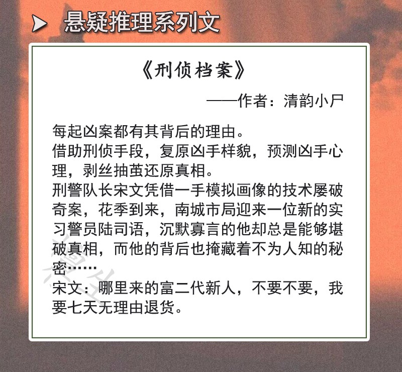 强强联手破案缉凶刑侦文,很现实又有警醒意义的一篇文。一共五个单元,每个案件层层推进,看似没有关联实际上都埋有伏笔,最终将之串联成一个整体。案情扑朔迷离又内有隐情,映射出人性黑暗的一面,同时又彰显正义。