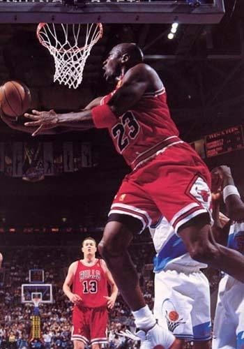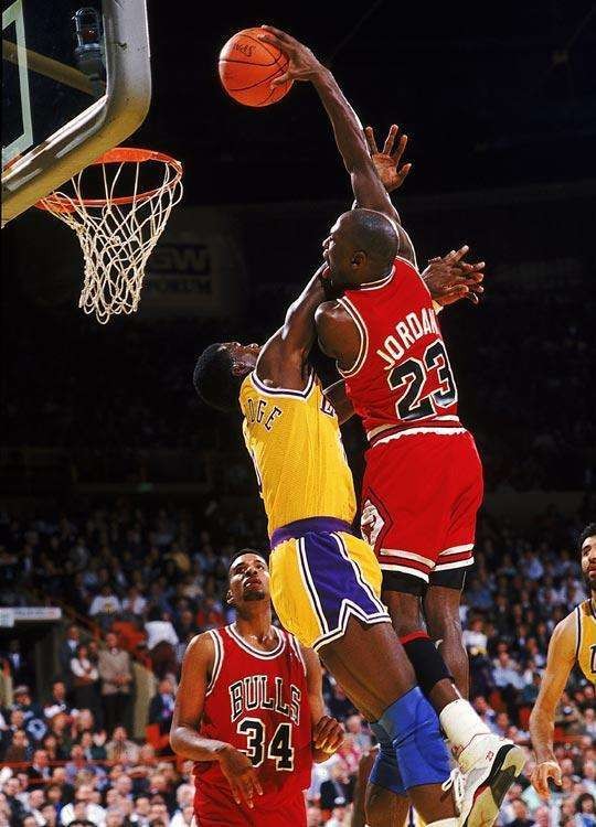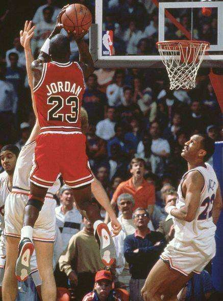 为什么乔丹的跳投那么难防?除了后仰的因素外,便是那爆炸的起跳高度了。要是扣篮、栏杆达到平框那还说得通,但乔丹连跳投都要平框,你告诉我这怎么防嘛?而骑士很悲催地成为了乔丹平框跳投的刀下魂,载入史册的“The Shot”便足以证明乔丹平框跳投的无解。