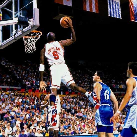 到了国际赛场的舞台上,老爷子依旧将自己的“流氓”本色展露无遗,根本不会放过一丝能够秀操作的机会。这不,面对空无一人的篮筐,乔丹便直接来了波平框扣篮。看看对手与观众那无奈又期待的目光,你就能感受到乔丹弹跳力与影响力的恐怖了。