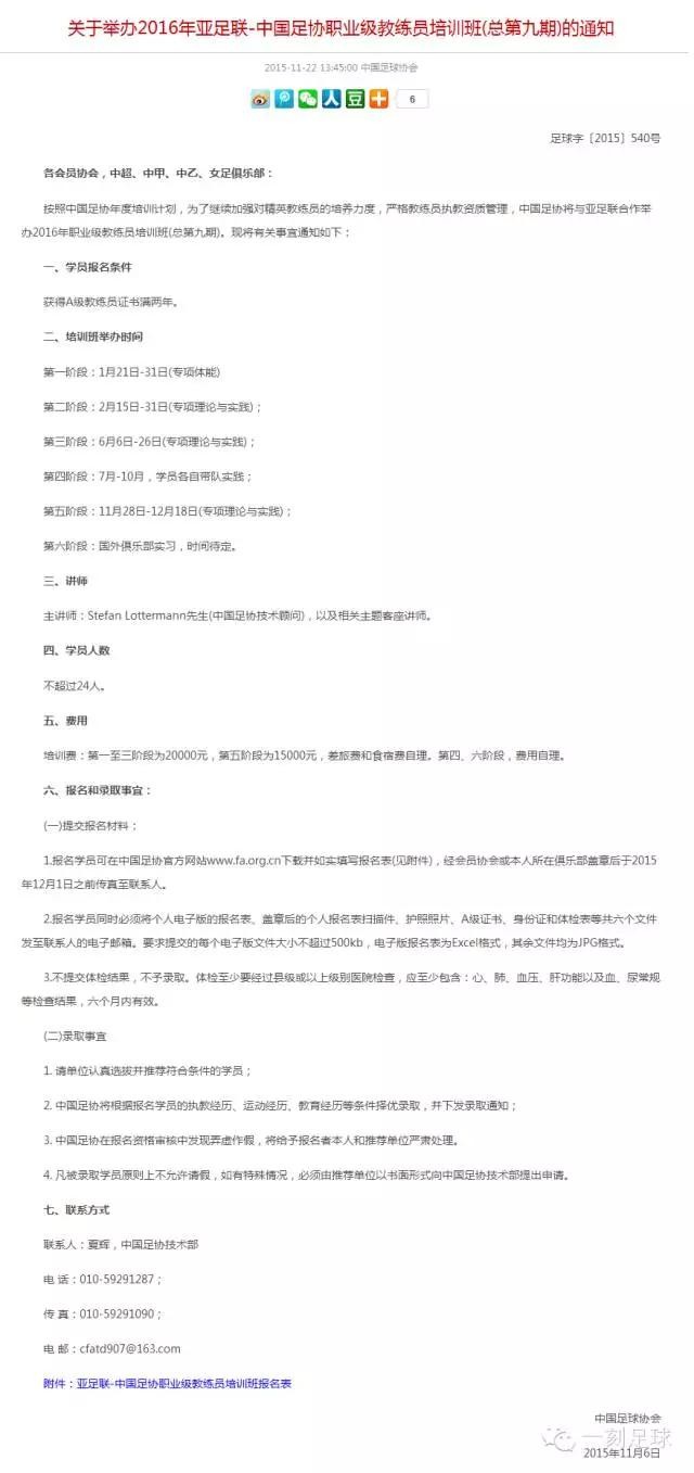 关于教练员培训班的信息,在足协官网的公开资料中可以看到,如A级教练员培训通知: