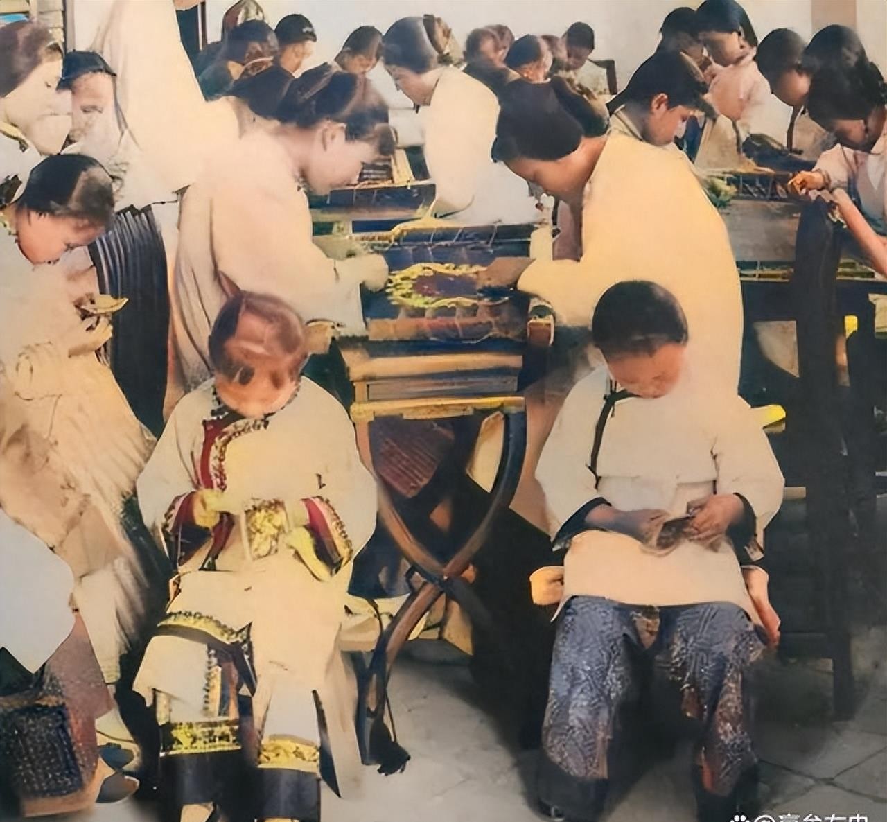 也成为了不少女性的职业。手工作坊里,女工们正聚精会神地进行着绣工,细腻而美丽的图案在她们的手中逐渐成形。这些女工成为了当时社会变革的见证者,也是上海城市化进程中的重要组成部分。