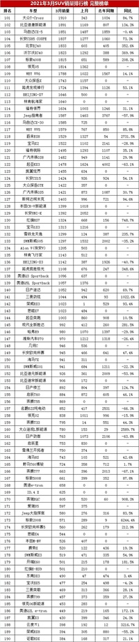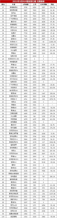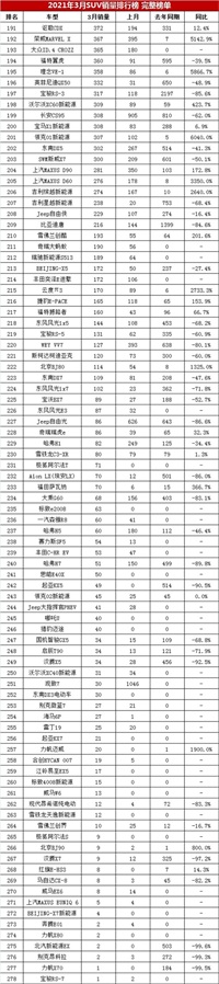 2021年3月278款SUV车型的销量及其排名情况,详见下表。