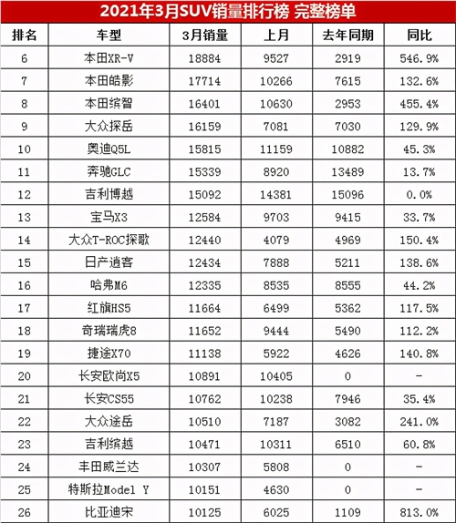 3月SUV销量排行榜完整版,CR-V超长安CS75,博越跌出前十?