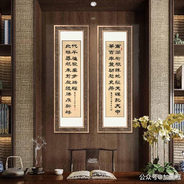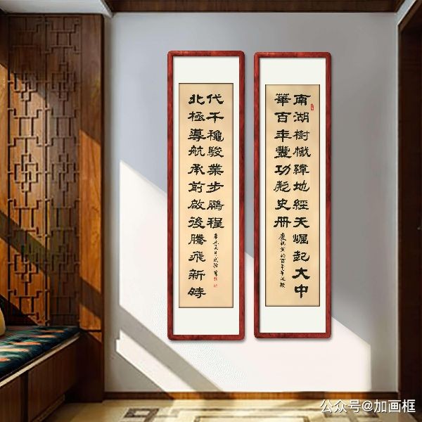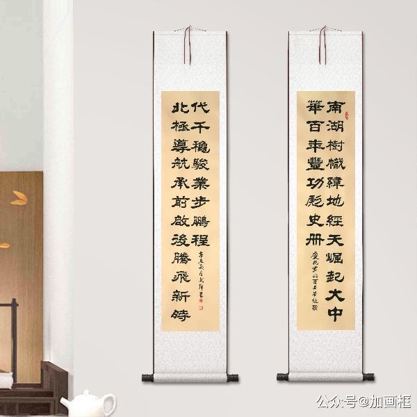 这幅对联用四尺对开长条仿古描龙宣纸书写,具体尺寸是136X34X2。