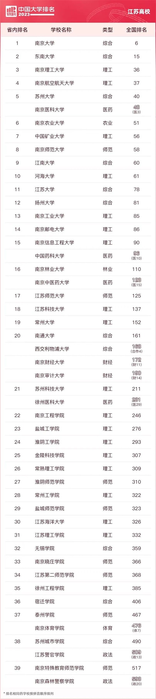 在主榜中,江苏省高校排名最靠前的南京大学位列全国第6名,与2022年持平。省内另一所“985”高校东南大学排名全国第15位,与2022年相比进步了1个名次。