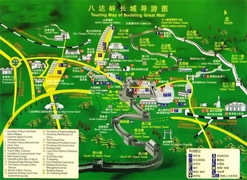 1.长城以主登城平台分为北线和南线,分别开放了北1楼至北12楼,南1楼至南7楼。北线比南线坡度要平缓一些,北8楼和南4楼都是长城的最佳观赏点,两楼之间有索道通达。