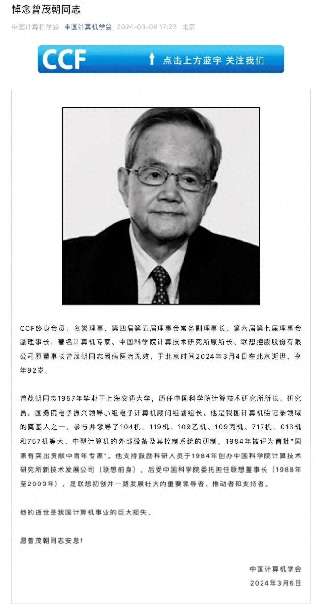 3月6日,据中国计算机学会官微消息,中国计算机学会(CCF)终身会员、名誉理事、第四届第五届理事会常务副理事长、第六届第七届理事会副理事长,著名计算机专家、中国科学院计算技术研究所原所长、联想控股股份有限公司原董事长曾茂朝同志因病医治无效,于北京时间2024年3月4日在北京逝世,享年92岁。