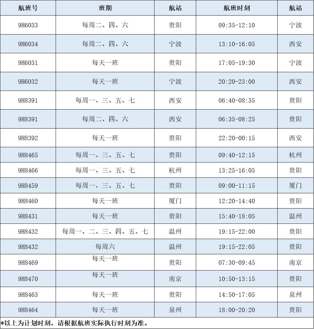 长安航空新航季:贵阳=宁波航线加密至每周10班