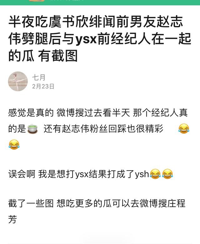 此后,又有传闻称赵志伟劈腿后与虞书欣前经纪人在一起。