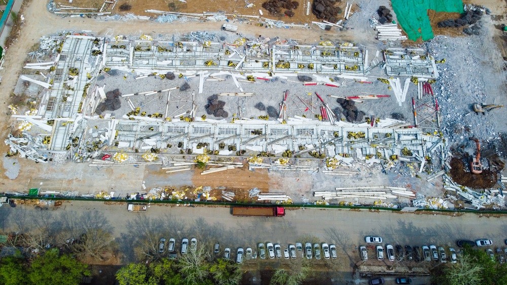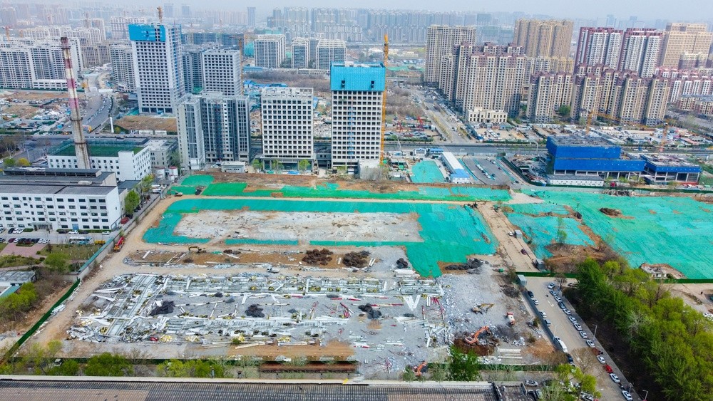 4月1日,记者在济南工业南路北侧的小鸭工业园区内看到,最北侧的两处大型厂房已经全部拆除,拆除的墙体留在原地等待清运,周边已经拆除的区域覆盖着绿色防尘网。