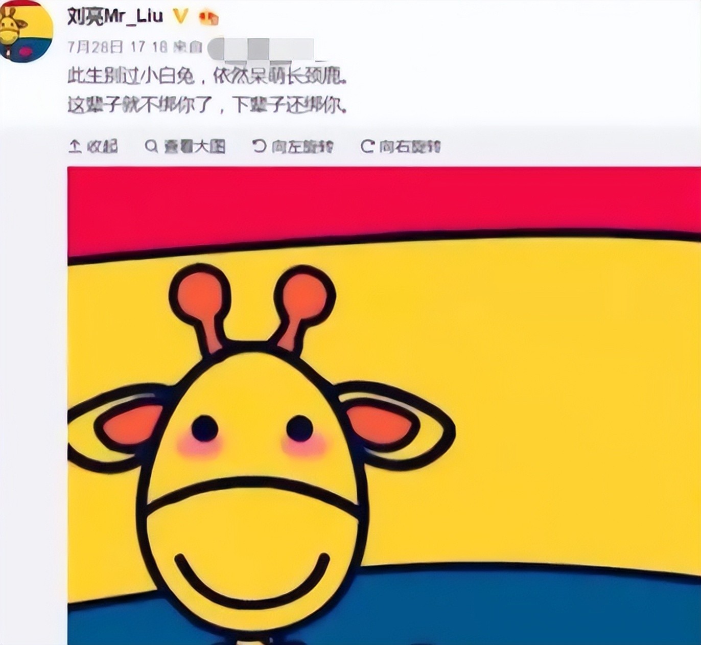 他还曾在社交平台发文称,此生别过小白兔,依然呆萌长颈鹿,这辈子不绑你了,下辈子还绑你。