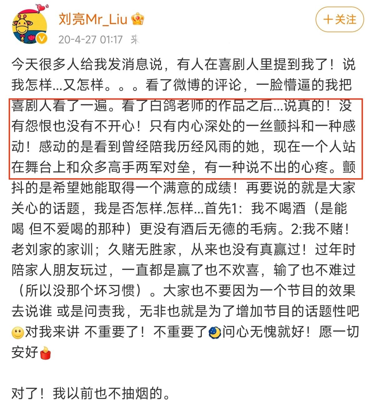 刘亮随即发出回应澄清,他在那段文字里提起白鸽的时候,虽然没了往日的深情,但言谈间还是非常友好尊重。