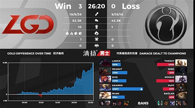 而且IG整体来说都打得很菜,就连Rookie也打得不行,只是相对来说稍微好了一点,比起其他几兄弟拉胯的场面少一点。要是分锅的话,怎么分都分不完。BP肯定是有问题的,但可能是受限于队员英雄池的限制,宁王直接被小花生锤烂,Theshy优势对线没怎么压住狼行,宝蓝又梦回S9,加上一个本来就是蹭局势的泡芙,阵容和队员的发挥都被完爆的IG,凭什么能够赢下来LGD呢?