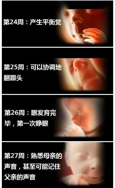 在第24周-25周的时候,宝宝就可以睡觉觉了,并且还可以在妈妈的腹中翻跟头了,到了26周的时候,是非常奇妙的时候,胎儿第一次开始睁眼了,眼睛的发育就完成了,在第27周的时候,如果妈妈经常和肚子里的宝宝说话,这个时候,宝宝就可以记得清楚妈妈的声音了。