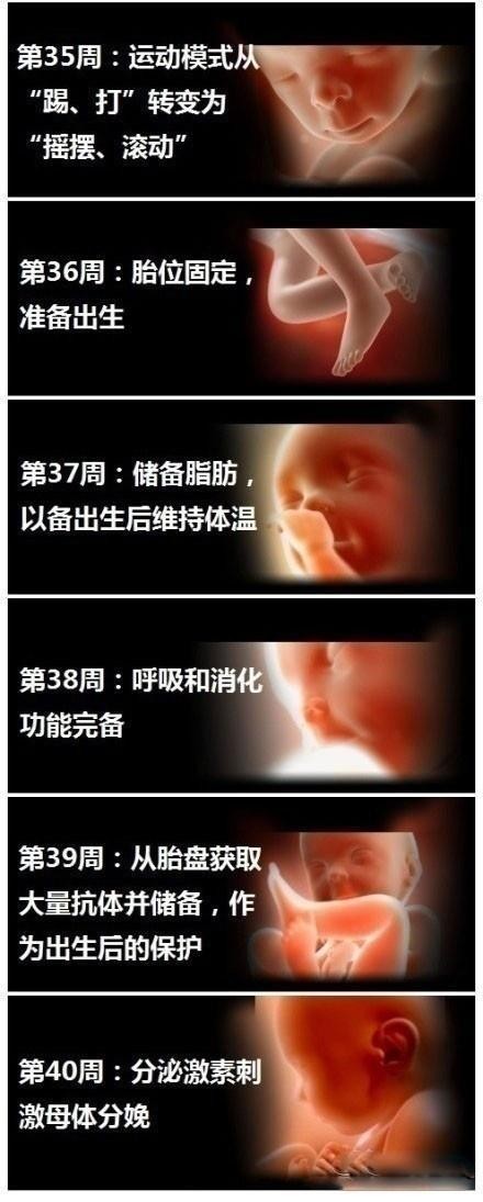 在35周左右的时候,宝宝踢打妈妈就减少了,转变为摇摆滚动的形式,在36周的时候,胎位几乎就固定了,因为这个时候,宝宝马上就要出生了,这个时候,宝宝就做好的准备,在37周的时候,宝宝的身体就开始储备脂肪,就是为了在出生以后,能够维持自己的体温,在38周的时候,胎儿的呼吸和消化功能几乎就完善了,在39周的时候,胎儿就从胎盘开始获取大量的抗体,为出生以后做了很好的身体保护伞,在大概40周左右的时候,分泌激素,开始促进孕妈妈的分娩,告诉妈妈我要出生了。