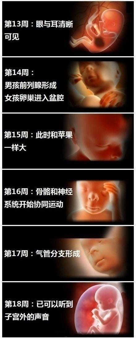 到了13周的时候,胎儿的耳朵和眼睛开始呈现出来,我们孕妇在做产检的时候,孕妈就可以在b超下看到,14周的时候,女孩的卵巢进入盆腔,男宝宝的前列腺开始形成,15周的时候,胎儿的大小就和苹果一样大了,甚至还可以再大一些,到了16周的时候,骨骼和神经系统就开始了协同的运动,那就是我们常说的胎动,17周的时候,胎儿的气管开始分支,并且形成,到了18周的时候,胎儿就可以听到子宫外的声音了,这个时候,有些宝妈就开始对自己的宝宝说话了。