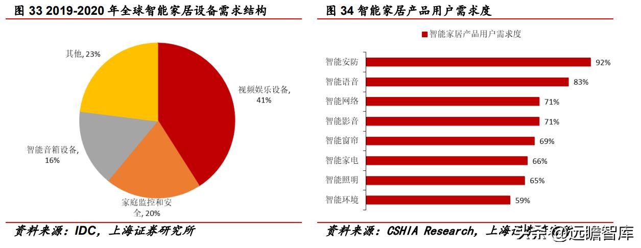IDC数据显示,全球智能家居设备中,视频娱乐、家庭监控和安全设备的市场份额较大,分别为 41%和 20%。