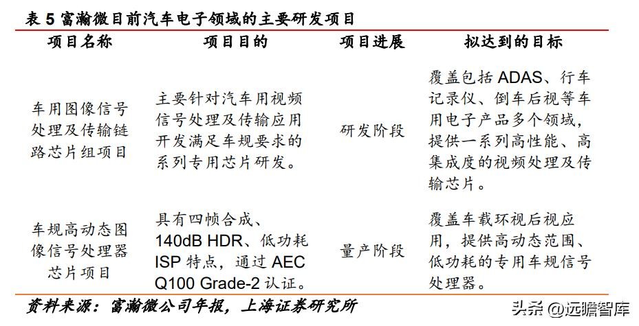 公司积极推进汽车电子领域研发创新,已推出一系列具有竞争力的产品。富瀚微在汽车电子领域已形成从车载后装到车载前装,从舱内到舱外的一系列富有竞争力的产品,包括:专业车规 ISP、模拟视频链路芯片、车载 DVR 芯片,以及一系列车载视频产品及解决方案,如:智能座舱、驾驶员行为检测、高清环视、行车记录仪、流媒体后视镜、电子后视镜等,涵盖前端摄像头、传输链路、后端主机的完整车规级视频芯片产品线,且多款芯片已通过 AEC-Q100 车规认证。