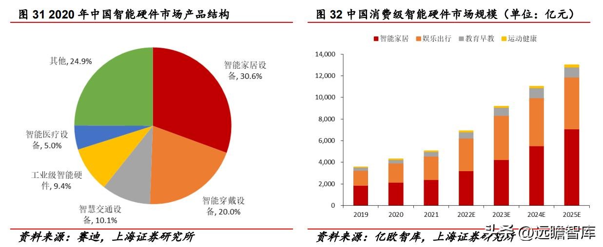 赛迪数据显示,2020年,中国智能硬件行业以智能家居设备为主,占比 30.6%。亿欧智库数据指出,2019年,中国智能家居市场规模为 1855.70 亿元,预计到2025年将上升至 7091.80 亿元,年均复合增长率为 25.0%,增速较快。
