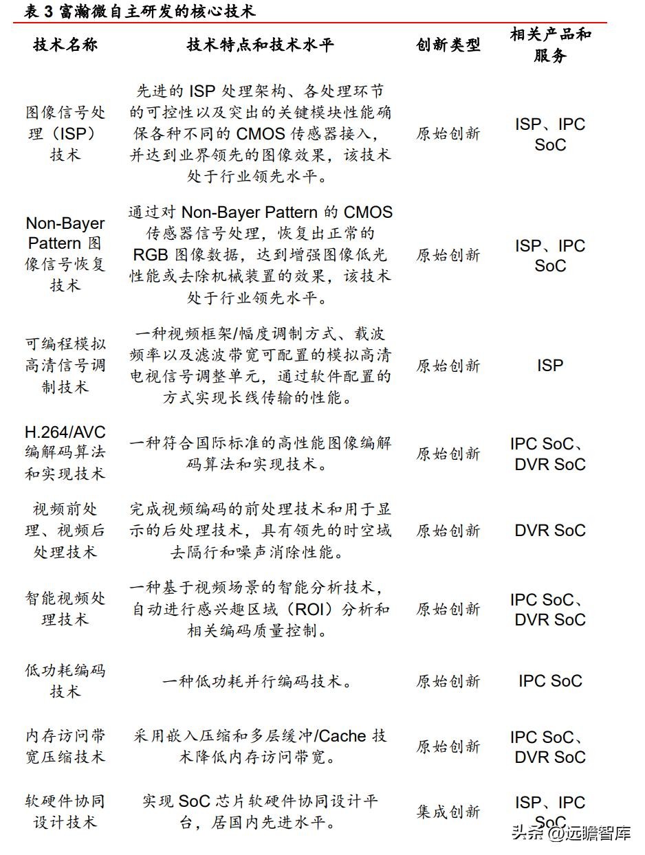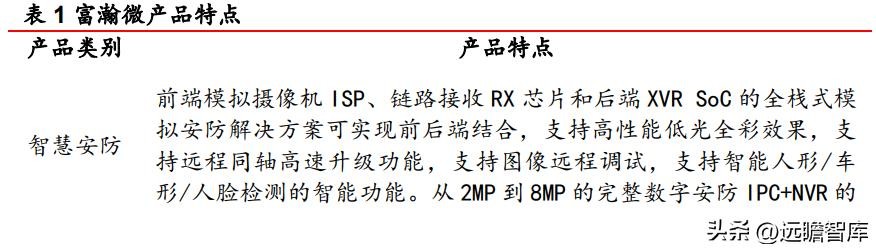 通过持续的研发创新,富瀚微目前已能提供模拟安防全套解决方案,涵盖前端 ISP,传输链路 RX,后端主控 XVR SoC,首创 T-Magic 同轴通信协议,提供客户同轴音频和高速升级功能;IPC 产品在图像效果方面树立标杆,通过系统软硬件整合,在产品方案方面起到较好的客户引导作用,被业内领先企业客户广泛认可。